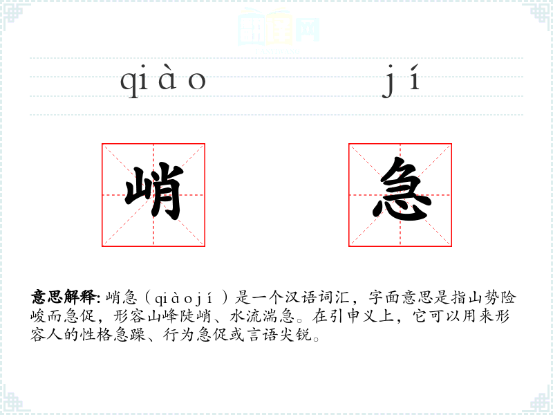 峭急(qiào jí)是一个汉语词汇,字面意思是指山势险峻而急促,形容山峰陡峭、水流湍急。在引申义上,它可以用来形容人的性格急躁、行为急促或言语尖锐。
