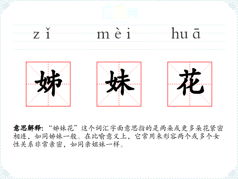 “姊妹花”这个词汇字面意思指的是两朵或更多朵花紧密相连,如同姊妹一般。在比喻意义上,它常用来形容两个或多个女性关系非常亲密,如同亲姐妹一样。