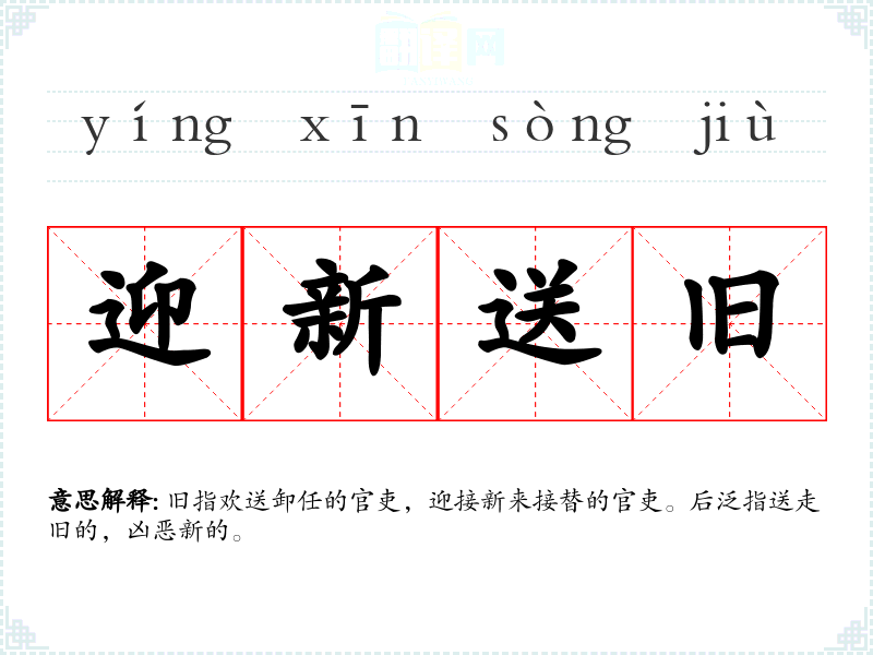 旧指欢送卸任的官吏,迎接新来接替的官吏。后泛指送走旧的,凶恶新的。