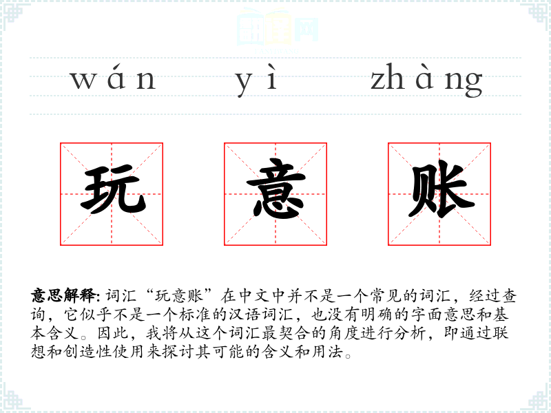 词汇“玩意账”在中文中并不是一个常见的词汇,经过查询,它似乎不是一个标准的汉语词汇,也没有明确的字面意思和基本含义。因此,我将从这个词汇最契合的角度进行分析,即通过联想和创造性使用来探讨其可能的含义和用法。