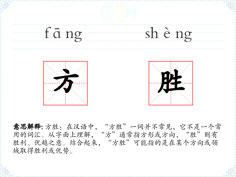 方胜:在汉语中,“方胜”一词并不常见,它不是一个常用的词汇。从字面上理解,“方”通常指方形或方向,“胜”则有胜利、优越之意。结合起来,“方胜”可能指的是在某个方向或领域取得胜利或优势。