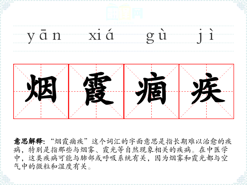 “烟霞痼疾”这个词汇的字面意思是指长期难以治愈的疾病,特别是指那些与烟雾、霞光等自然现象相关的疾病。在中医学中,这类疾病可能与肺部或呼吸系统有关,因为烟雾和霞光都与空气中的微粒和湿度有关。