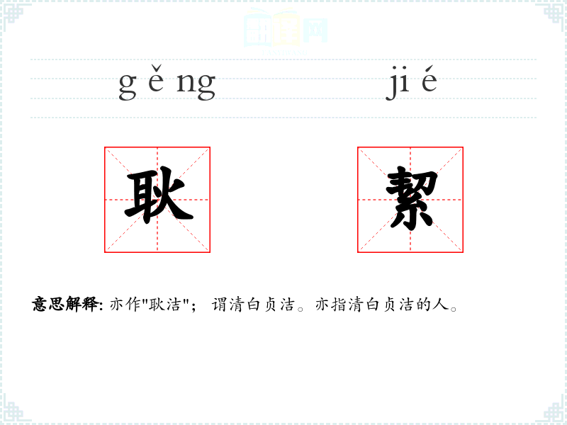 亦作"耿洁"; 谓清白贞洁。亦指清白贞洁的人。