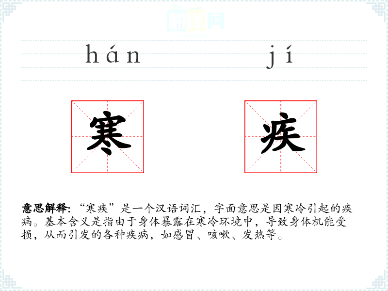 在英语中,与“寒疾”相对应的词汇可能是“cold”或“flu”。在不同文化中,对寒冷引起的疾病的认识和处理方式可能有所不同,但都强调了保暖和预防的重要性。