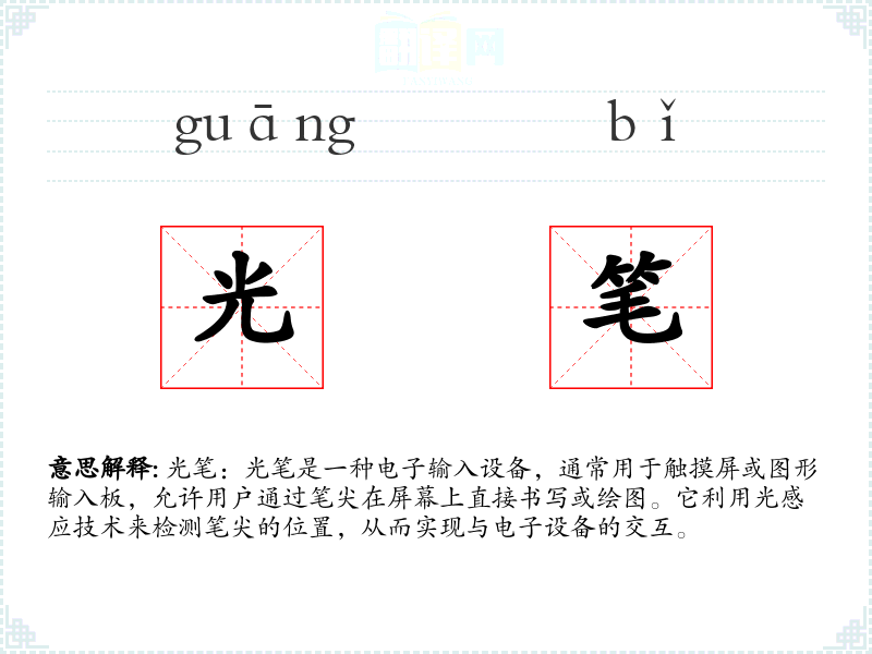 "光笔"的意思解释、光笔是什么意思由翻译网汉语词典查词提供。