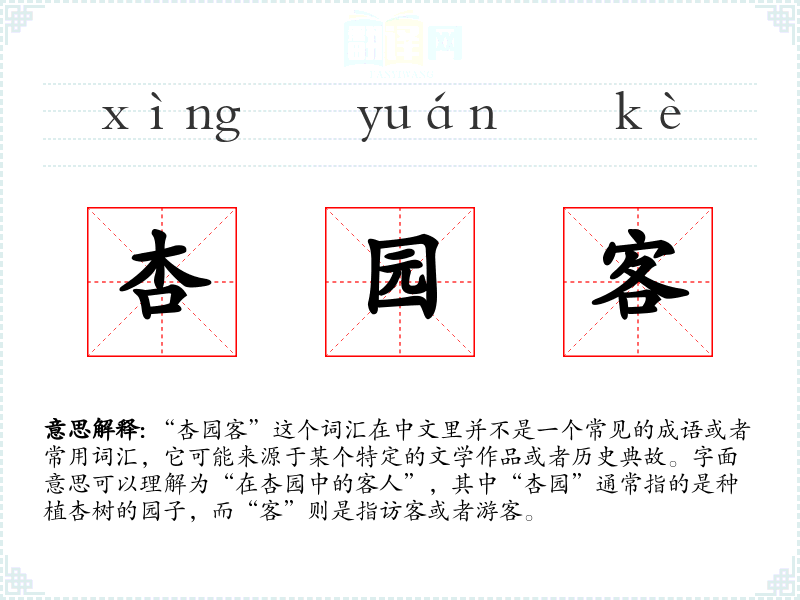 由于“杏园客”是一个较为特定的中文词汇,它在其他语言或文化中可能没有直接对应的词汇。不过,类似的意境可能在其他文化中也有表达,比如英语中的“orchard visitor”可能在某种程度上传达相似的意境。