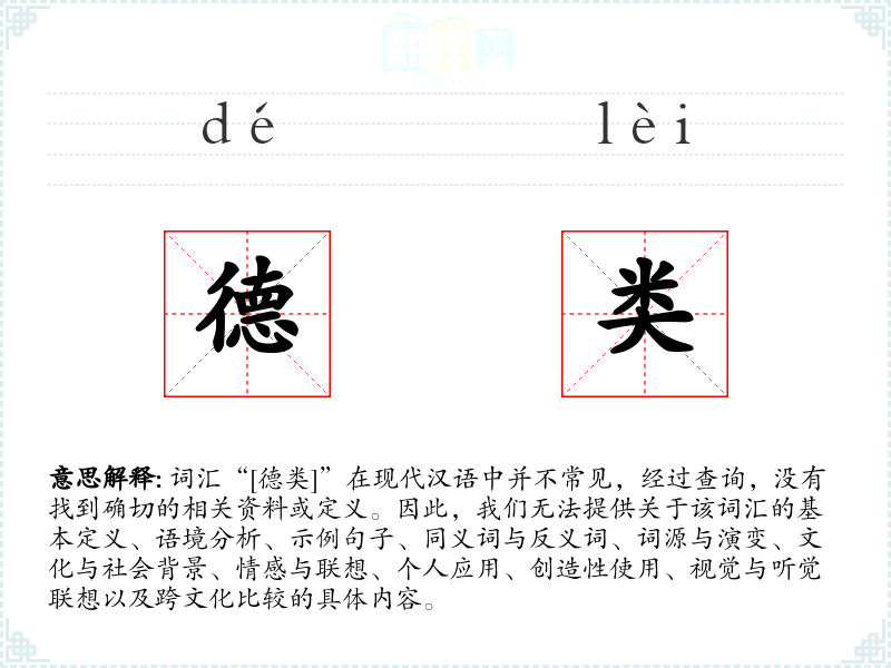 词汇“[德类]”在现代汉语中并不常见,经过查询,没有找到确切的相关资料或定义。因此,我们无法提供关于该词汇的基本定义、语境分析、示例句子、同义词与反义词、词源与演变、文化与社会背景、情感与联想、个人应用、创造性使用、视觉与听觉联想以及跨文化比较的具体内容。