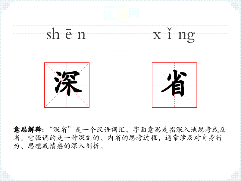 “深省”一词源自汉语,其构成由“深”和“省”两个字组成。在古代汉语中,“省”已有反思、检查的含义,而“深”则加强了这种反思的深度。随着时间的推移,这个词的用法和含义基本保持稳定。