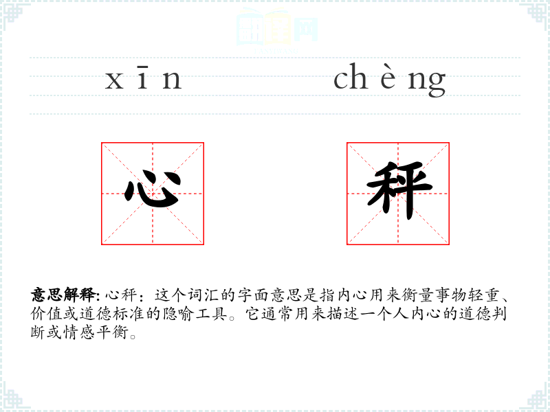 心秤:这个词汇的字面意思是指内心用来衡量事物轻重、价值或道德标准的隐喻工具。它通常用来描述一个人内心的道德判断或情感平衡。