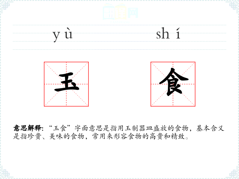 “玉食”字面意思是指用玉制器皿盛放的食物,基本含义是指珍贵、美味的食物,常用来形容食物的高贵和精致。
