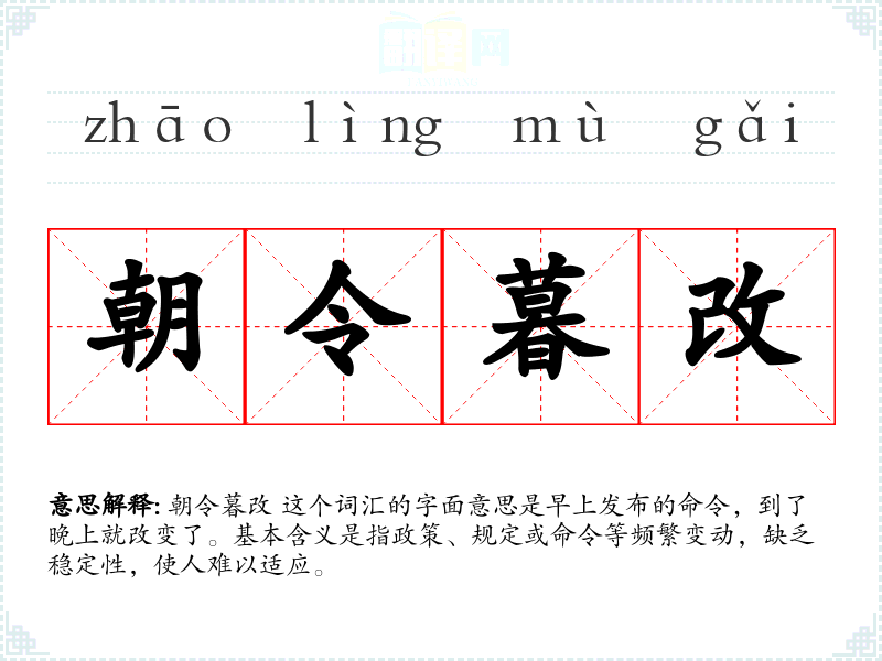 朝令暮改 这个词汇的字面意思是早上发布的命令,到了晚上就改变了。基本含义是指政策、规定或命令等频繁变动,缺乏稳定性,使人难以适应。