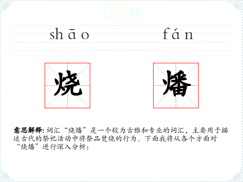 词汇“烧燔”是一个较为古雅和专业的词汇,主要用于描述古代的祭祀活动中将祭品焚烧的行为。下面我将从各个方面对“烧燔”进行深入分析: