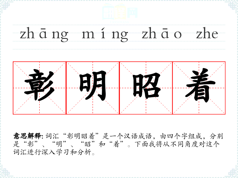 词汇“彰明昭着”是一个汉语成语,由四个字组成,分别是“彰”、“明”、“昭”和“着”。下面我将从不同角度对这个词汇进行深入学*和分析。