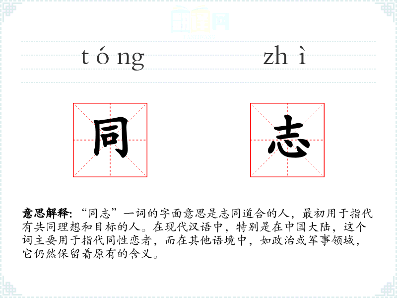 “同志”一词的字面意思是志同道合的人,最初用于指代有共同理想和目标的人。在现代汉语中,特别是在**大陆,这个词主要用于指代同性恋者,而在其他语境中,如政治或军事领域,它仍然保留着原有的含义。