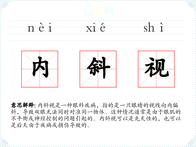 “内斜视”一词源自医学术语,其中“内”指的是向内,“斜视”指的是视线偏斜。这个词在医学文献中有着悠久的历史,随着医学的发展,其定义和治疗方法也在不断进步。