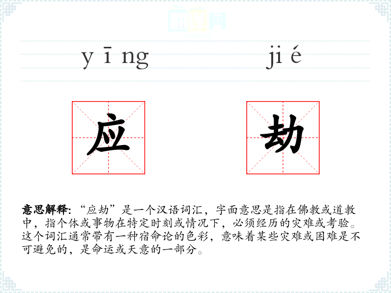“应劫”是一个汉语词汇,字面意思是指在**或道教中,指个体或事物在特定时刻或情况下,必须经历的灾难或考验。这个词汇通常带有一种宿命论的色彩,意味着某些灾难或困难是不可避免的,是命运或天意的一部分。