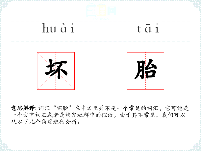 词汇“坏胎”在中文里并不是一个常见的词汇,它可能是一个方言词汇或者是特定社群中的俚语。由于其不常见,我们可以从以下几个角度进行分析: