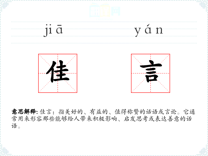 佳言:指美好的、有益的、值得称赞的话语或言论。它通常用来形容那些能够给人带来积极影响、启发思考或表达善意的话语。