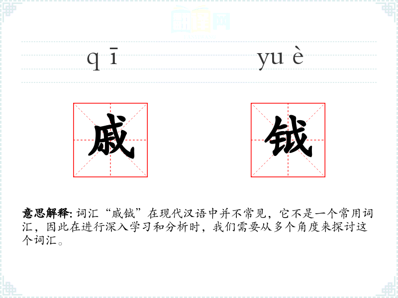 词汇“戚钺”在现代汉语中并不常见,它不是一个常用词汇,因此在进行深入学*和分析时,我们需要从多个角度来探讨这个词汇。