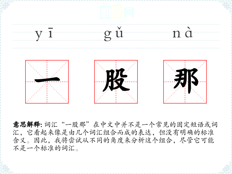 由于“一股那”不是一个标准的词汇,我们无法给出一个确切的基本定义。它可能是由“一股”和“那”两个词汇组合而成的,其中“一股”通常指的是一种力量、气味、风格或者是一群人,而“那”是一个指示代词,用来指代特定的事物或人。