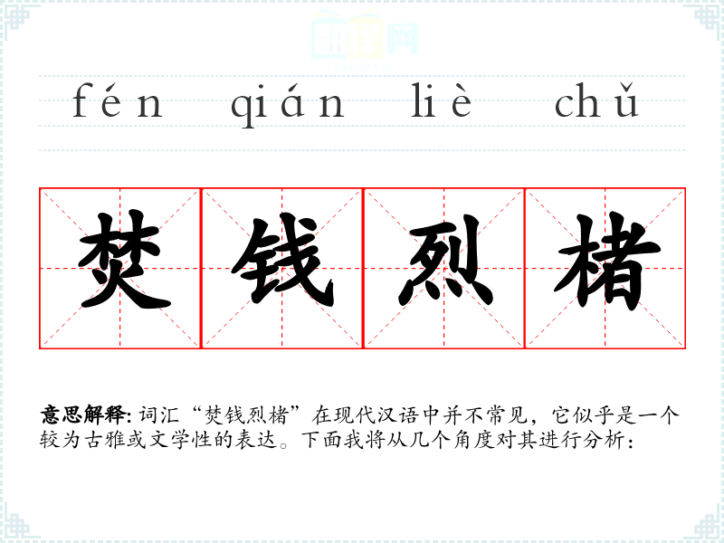 词汇“焚钱烈楮”在现代汉语中并不常见,它似乎是一个较为古雅或文学性的表达。下面我将从几个角度对其进行分析: