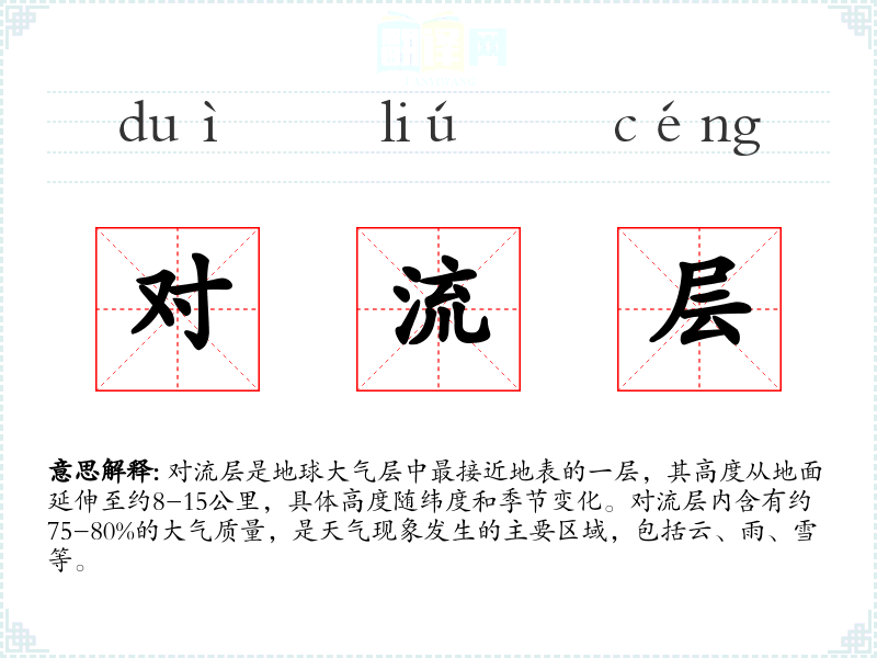 - 反义词:平流层(对流层之上的大气层)