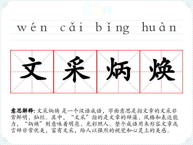文采炳焕 是一个汉语成语,字面意思是指文章的文采非常鲜明、灿烂。其中,“文采”指的是文章的辞藻、风格和表达能力,“炳焕”则意味着明亮、光彩照人。整个成语用来形容文章或言辞非常优美,富有文采,给人以强烈的视觉和心灵上的美感。