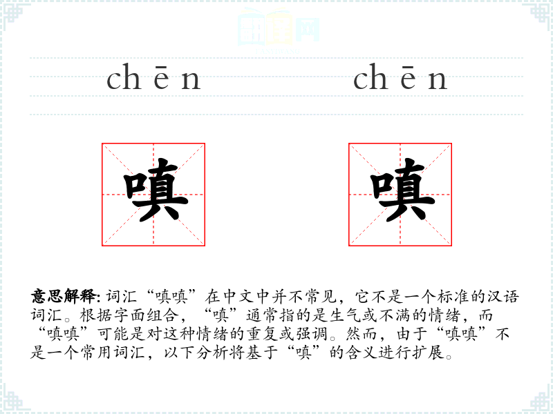 - 专业领域:在心理学或情感研究中,“嗔”可能被用来描述特定的情绪状态。