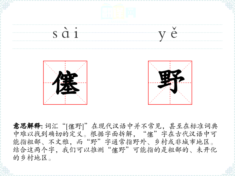 词汇“[僿野]”在现代汉语中并不常见,甚至在标准词典中难以找到确切的定义。根据字面拆解,“僿”字在古代汉语中可能指粗鄙、不文雅,而“野”字通常指野外、乡村或非城市地区。结合这两个字,我们可以推测“僿野”可能指的是粗鄙的、未开化的乡村地区。