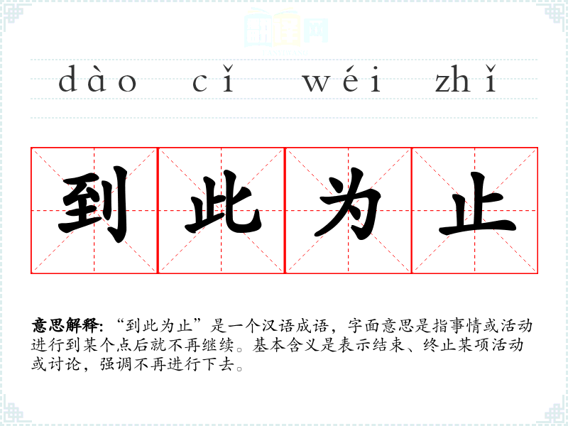 “到此为止”是一个汉语成语,字面意思是指事情或活动进行到某个点后就不再继续。基本含义是表示结束、终止某项活动或讨论,强调不再进行下去。