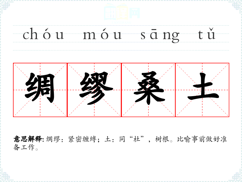 绸缪:紧密缠缚;土:同“杜”,树根。比喻事前做好准备工作。