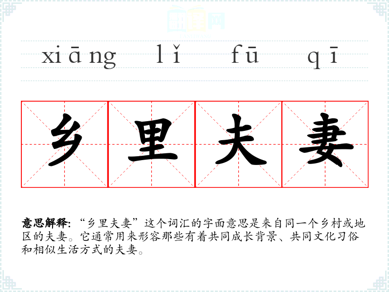 在文学作品中,“乡里夫妻”可能被用来描绘一种朴素、纯真的爱情,强调夫妻间的默契和相互理解。在口语中,这个词汇可能带有一定的地域色彩,用来指代那些来自同一地方的夫妻。在专业领域,如社会学或人类学,这个词汇可能被用来探讨地域文化对婚姻关系的影响。
