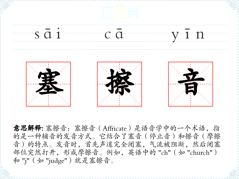 塞擦音:塞擦音(Affricate)是语音学中的一个术语,指的是一种辅音的发音方式。它结合了塞音(停止音)和擦音(摩擦音)的特点。发音时,首先声道完全闭塞,气流被阻断,然后闭塞部位突然打开,形成摩擦音。例如,英语中的 "ch"(如 "church")和 "j"(如 "judge")就是塞擦音。