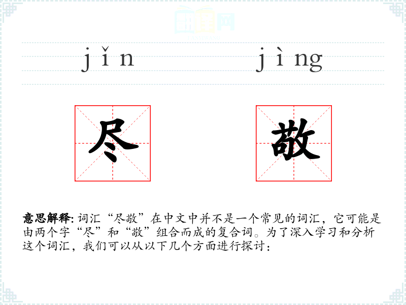词汇“尽敬”在中文中并不是一个常见的词汇,它可能是由两个字“尽”和“敬”组合而成的复合词。为了深入学*和分析这个词汇,我们可以从以下几个方面进行探讨: