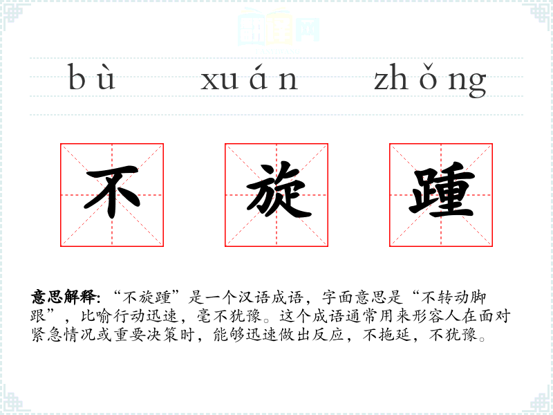 “不旋踵”是一个汉语成语,字面意思是“不转动脚跟”,比喻行动迅速,毫不犹豫。这个成语通常用来形容人在面对紧急情况或重要决策时,能够迅速做出反应,不拖延,不犹豫。