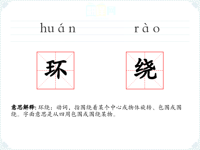 环绕:动词,指围绕着某个中心或物体旋转、包围或围绕。字面意思是从四周包围或围绕某物。