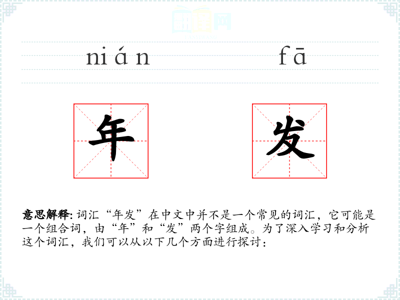 词汇“年发”在中文中并不是一个常见的词汇,它可能是一个组合词,由“年”和“发”两个字组成。为了深入学习和分析这个词汇,我们可以从以下几个方面进行探讨: