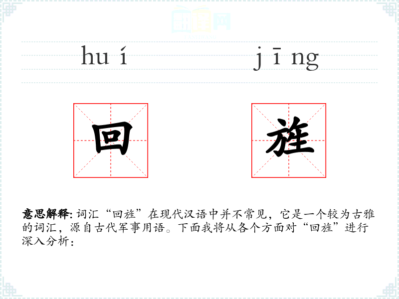 词汇“回旌”在现代汉语中并不常见,它是一个较为古雅的词汇,源自古代军事用语。下面我将从各个方面对“回旌”进行深入分析: