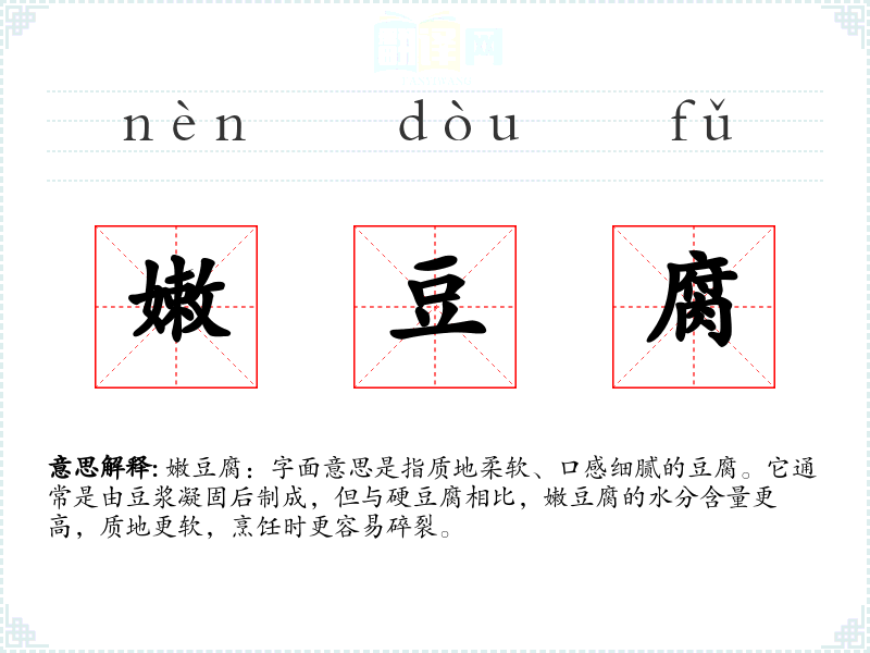 - 反义词:硬豆腐、老豆腐(质地较硬,水分含量较低)