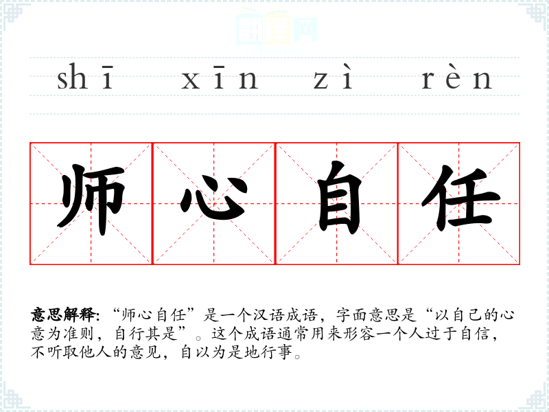 “师心自任”是一个汉语成语,字面意思是“以自己的心意为准则,自行其是”。这个成语通常用来形容一个人过于自信,不听取他人的意见,自以为是地行事。