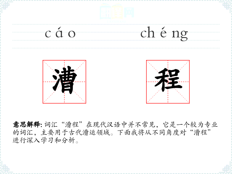 词汇“漕程”在现代汉语中并不常见,它是一个较为专业的词汇,主要用于古代漕运领域。下面我将从不同角度对“漕程”进行深入学*和分析。