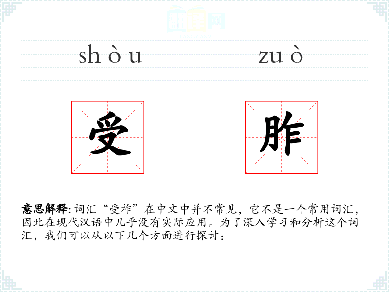 词汇“受祚”在中文中并不常见,它不是一个常用词汇,因此在现代汉语中几乎没有实际应用。为了深入学*和分析这个词汇,我们可以从以下几个方面进行探讨:
