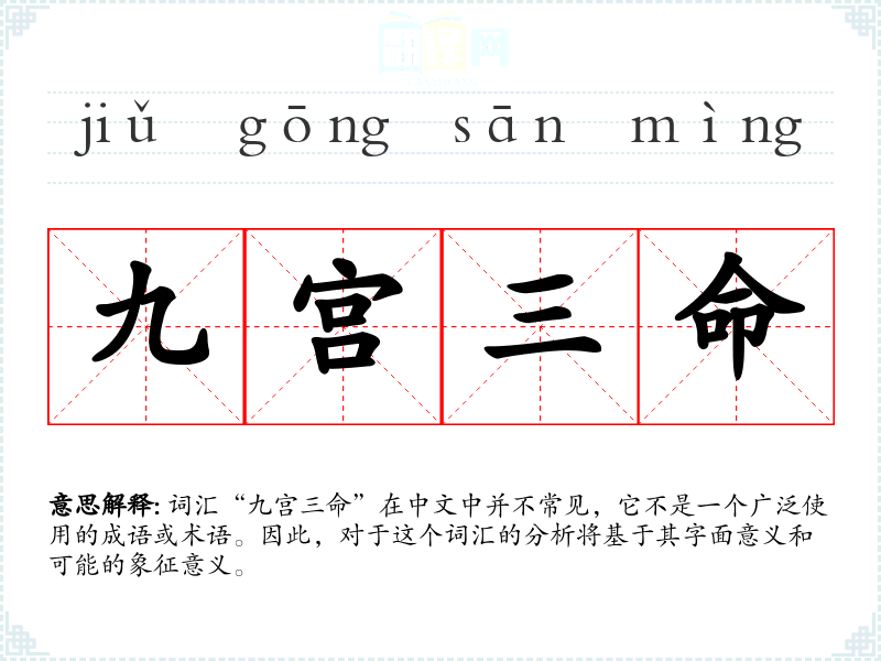 词汇“九宫三命”在中文中并不常见,它不是一个广泛使用的成语或术语。因此,对于这个词汇的分析将基于其字面意义和可能的象征意义。