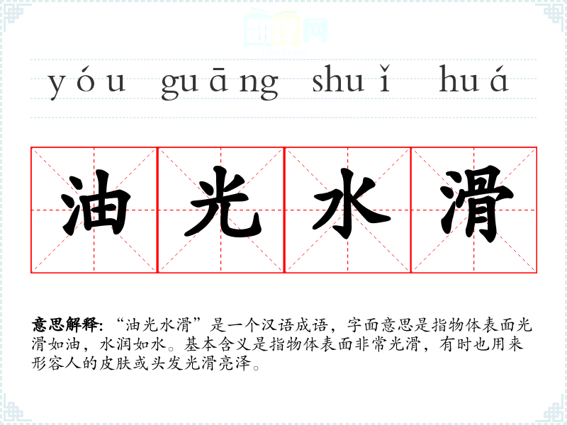 “油光水滑”是一个汉语成语,字面意思是指物体表面光滑如油,水润如水。基本含义是指物体表面非常光滑,有时也用来形容人的皮肤或头发光滑亮泽。