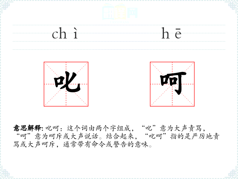 - 反义词:鼓励、赞扬、安慰。这些词与“叱呵”形成鲜明对比,表示正面的激励或支持。