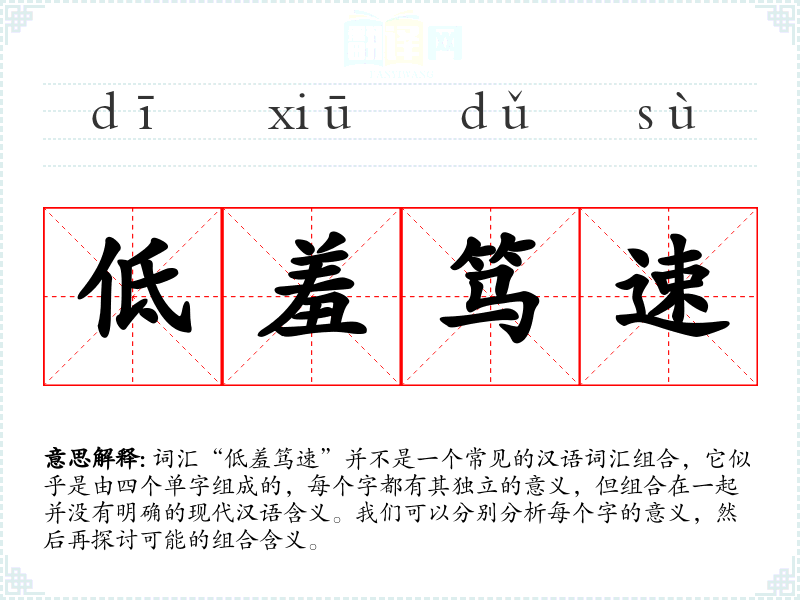 词汇“低羞笃速”并不是一个常见的汉语词汇组合,它似乎是由四个单字组成的,每个字都有其独立的意义,但组合在一起并没有明确的现代汉语含义。我们可以分别分析每个字的意义,然后再探讨可能的组合含义。