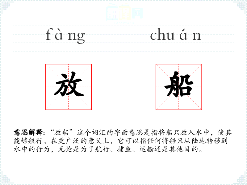 “放船”这个词汇的字面意思是指将船只放入水中,使其能够航行。在更广泛的意义上,它可以指任何将船只从陆地转移到水中的行为,无论是为了航行、捕鱼、运输还是其他目的。