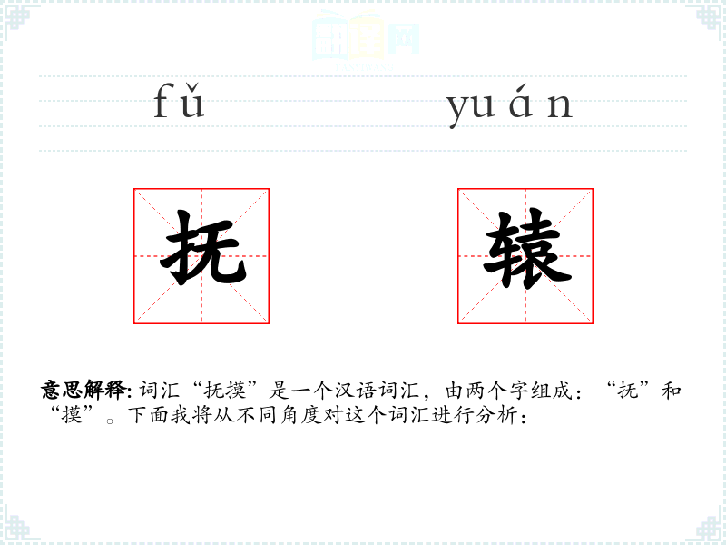“抚”字古汉语中意为安抚、安慰,“摸”字则有摸索、触摸的意思。两个字结合,形成了现代汉语中的“抚摸”,强调了触摸的温柔和关怀。