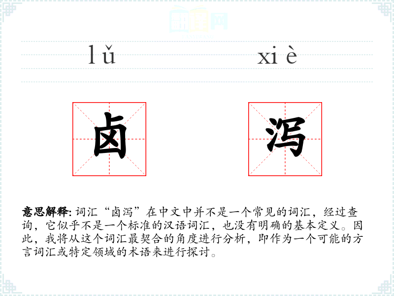 由于“卤泻”不是一个标准汉语词汇,我们无法给出一个确切的字面意思和基本含义。它可能是某个地区方言中的词汇,或者是某个特定行业的术语。
