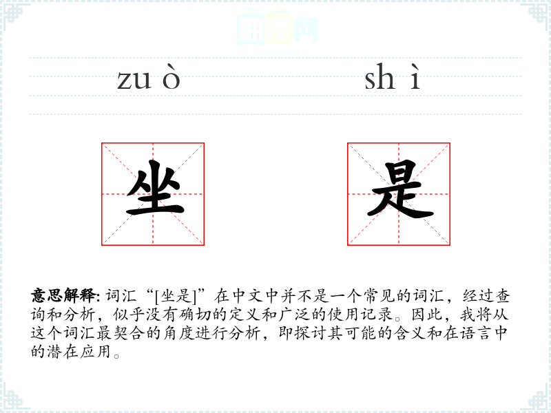 词汇“[坐是]”在中文中并不是一个常见的词汇,经过查询和分析,似乎没有确切的定义和广泛的使用记录。因此,我将从这个词汇最契合的角度进行分析,即探讨其可能的含义和在语言中的潜在应用。